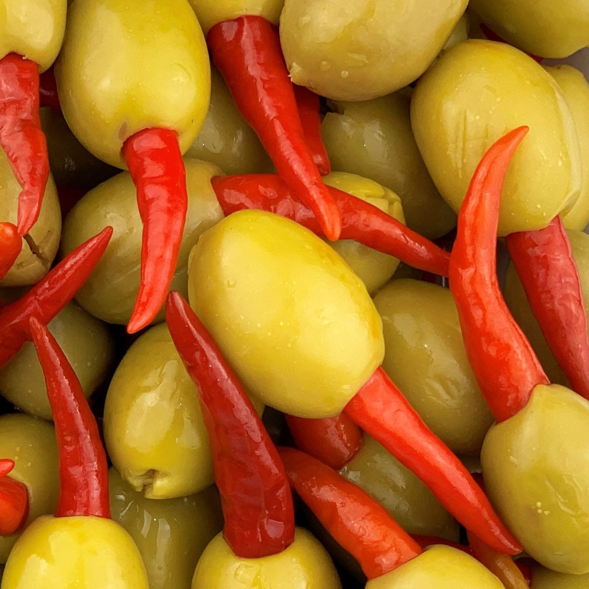 Urkärnade gröna oliver marinerade med heta chiliflakes och olja. Du kommer att uppleva en stark kick från chilin innan de läckert milda oliverna tar över. Lite svagare än piri-piri.